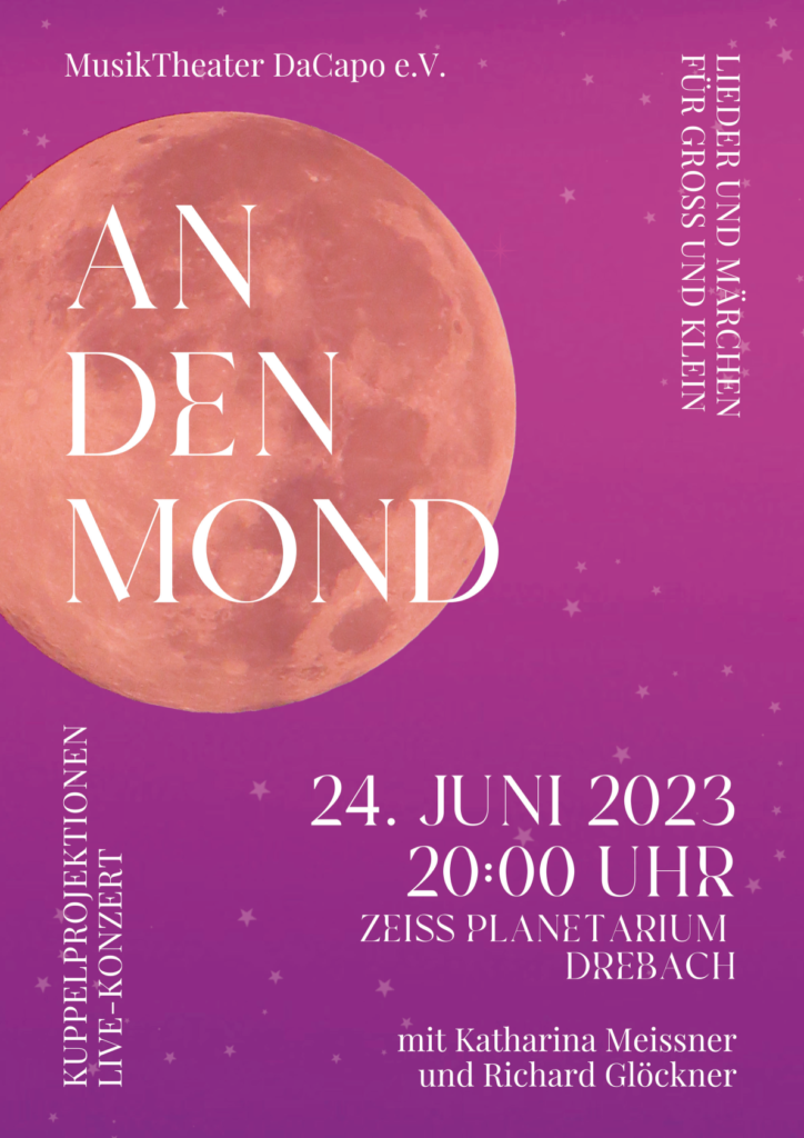 Seit Jahrtausenden sind die Menschen vom Mond fasziniert. Es ranken sich unzählige Sagen und Märchen um mystische Mondbewohner und die Wunderkräfte des Mondes. Tausende Werke aller Kunstsparten wurden vom Geschehen am Nachthimmel inspiriert. Mit „An den Mond“ haben Katharina Meissner und Richard Glöckner ein Konzertprogramm mit Klavierbegleitung und Musik verschiedener Genres, von Klassik über Musical, Jazz und Pop geschaffen. Es erklingen u.a. die bekannten Stücke „Fly me to the Moon“ und „Junimond“, aber auch „Mondlicht“ aus Cats und „Ich möchte so gerne zum Mond“ aus der Sesamstraße. Die vorgetragenen „Mondmärchen“ sind faszinierende Geschichten aus verschiedenen Kulturkreisen. Der Sternenhimmel des Zeiss Planetariums ist der ideale Ort, um diese wunderbare musikalische Reise zum Mond für Groß und Klein zu beginnen. Kommen Sie mit?